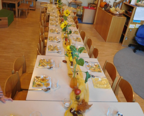 Wir feiern die religiösen Feste im Jahreskreis: Erntedank, St. Martin, Nikolaus, Weihnachten und Ostern mit religiösen Anschauungen, gemeinsamen Feiern und Speisen an einer schön gedeckten Tafel. Dabei werden den Kindern soziale Werte wie Nächstenliebe vermittelt, wodurch Religiosität erlebbar wird.